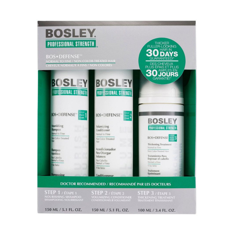 Bosley Professional Strength BosDefense 3-Step System Starter Kit for Non-Color-Treated Hair is for those who want to maintain their hair density and take more defensive action against thinning. Contains LifeXtend Complex formulated to inhibit DHT build-up and provides anti-aging protection. This 3-step system helps provide thicker, full-looking hair in as little as 30-days!