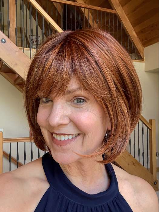 Aria by Rene of Paris is from the Alexander Couture Collection. This short bob wig gets its stunning silhouette from its “invisible layers.” The soft-cut bangs complete its elegant look. The heat friendly synthetic fiber gives you the option to style the hair sleek or choppy. The cap construction includes an extended lace front and lace part for a realistic appearance. The adjustable tabs in the back nape area create a secure and comfortable fit.