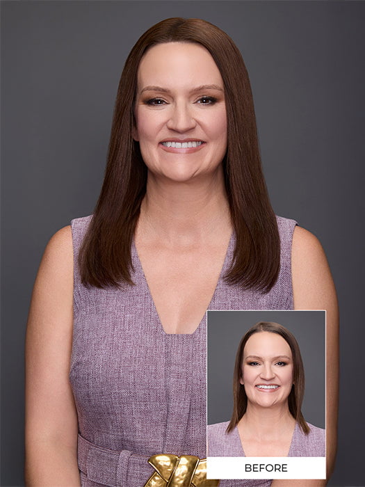• Four 1 ⅛” clips - offer easy applications and help keep your topper securely in place. Clips can be removed for wig tape or bonded application.
