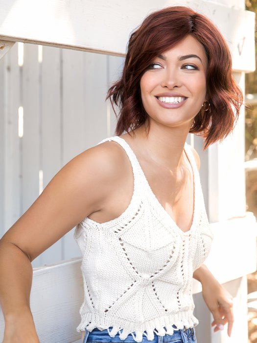 Ella by Rene of Paris is a mid-length synthetic wig. This beachy wave bob is a feathered-cut layered style showing its artistic precision while still being playful and fun. The lace front and lace part create the most natural look. Ella is part of The Orchid Collection.