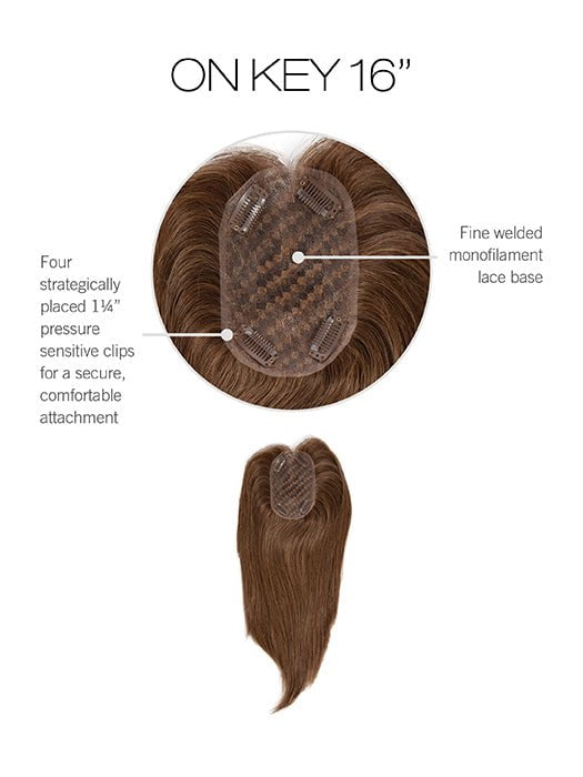 On Key by Raquel Welch is part of the Transformations Collection. This lightweight clip-in topper is a work of art made with 100% human hair. The base is a single piece of fine-welded monofilament lace to help this topper lie flat on the head to minimize bulk, bumps, and ridges.